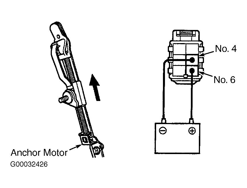 Disconnect shoulder belt anchor sensor 6-pin connector. See Fig 1. Connect positive battery voltage to terminal No. 6 and negative battery voltage to terminal No. 4. Slider should move upward. Reverse polarity. Slider should move downward. If slider does not operate as specified, replace anchor motor.