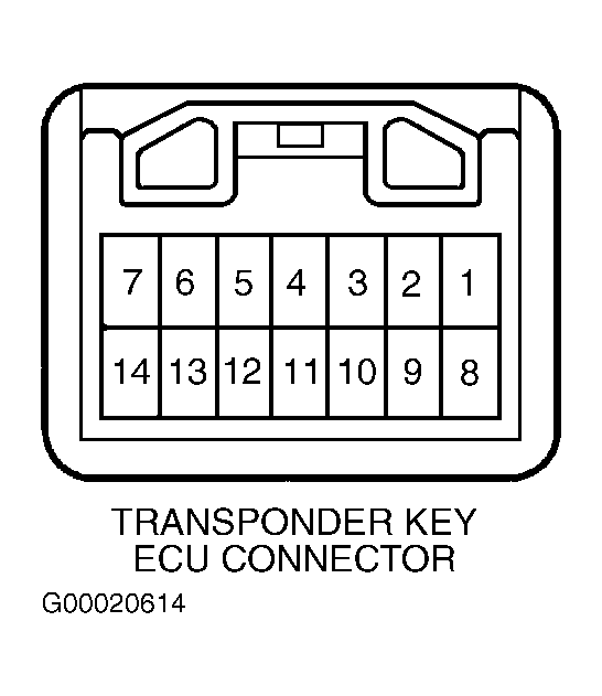 - Turn ignition on. Measure voltage (backprobe) between transponder key ECU terminals No. 2 (Black wire) and No. 14 (White/Black wire). See Figure. About 10-14 volts should be present. Turn ignition off. Disconnect transponder key ECU connector. Measure voltage between transponder key ECU connector terminal No. 1 (Violet/Yellow wire) and No. 14 (White/Black wire). About 10-14 volts should be present. If voltages are not to specification, go to next step. If voltages are to specification, check next component listed in TROUBLE SHOOTING SYMPTOMS table.