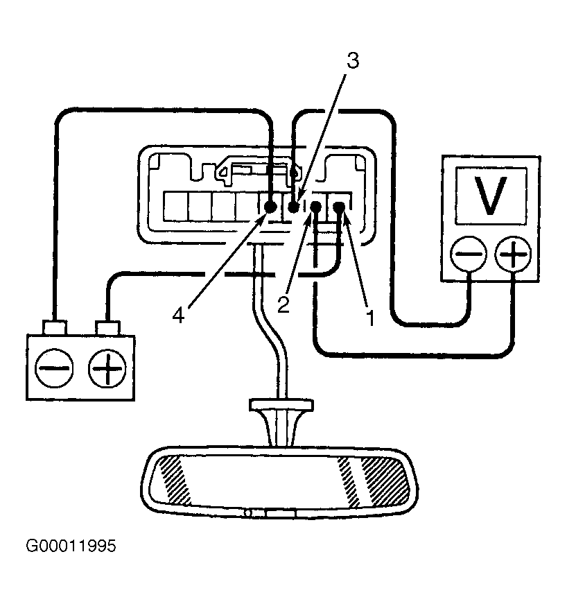 Remove inside rear view mirror. Using jumper wires, apply positive battery lead to terminal No. 1 and negative battery lead to terminal No. 4 at rear view mirror connector. See Fig 1. Connect positive lead of voltmeter to terminal No. 2 and negative lead to terminal No. 3. Press mirror switch. Observe voltmeter and shine an electric light on face of mirror. Battery voltage should be present and face should change from bright to dark. Replace rear view mirror as necessary.
