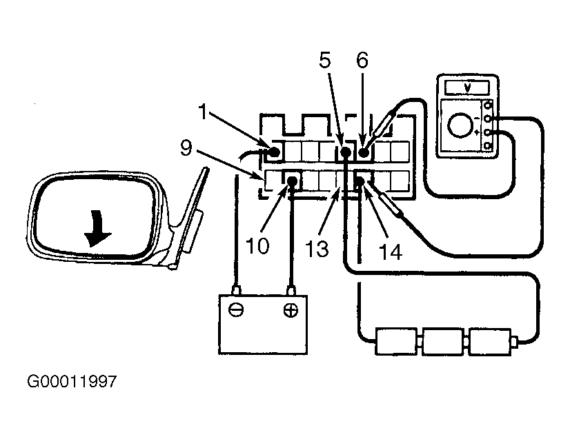 - Disconnect power mirror motor harness connector. Connect three 1.5-volt dry cell batteries together in series. See Fig 1. Connect dry cell battery positive lead to terminal No. 5 and negative lead to terminal No. 14. Connect positive lead of voltmeter to terminal No. 6 and negative lead to terminal No. 14.