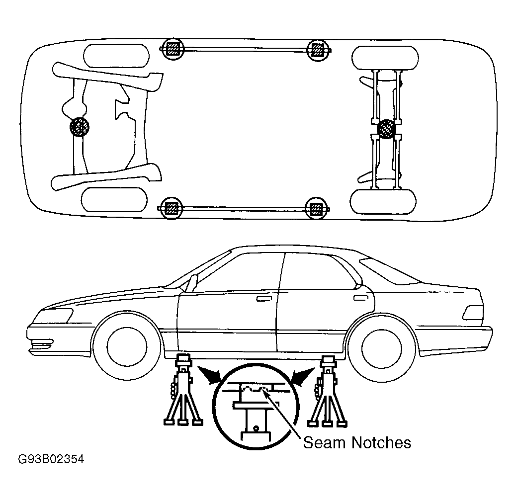 Place manufacturer-supplied jack under reinforced support points of sill, between front and rear wheels. Safety stands may also be placed at these points. See Figure, Figure or Figure .
