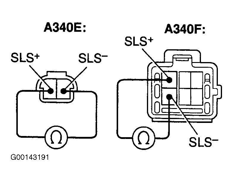 - Disconnect the solenoid connector. Using an ohmmeter, measure resistance between terminal SLS+ and SLS-. See Fig 1. Resistance should be 21-27 ohms. If resistance value is not as specified, replace the solenoid. See Figure.