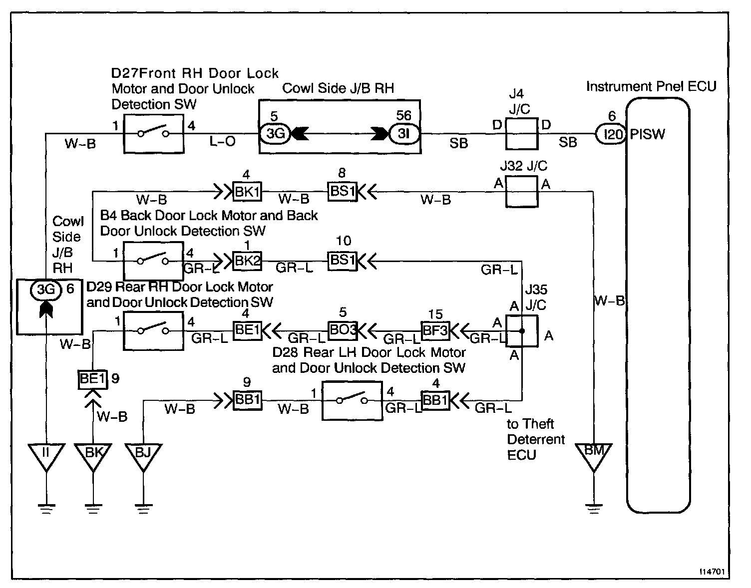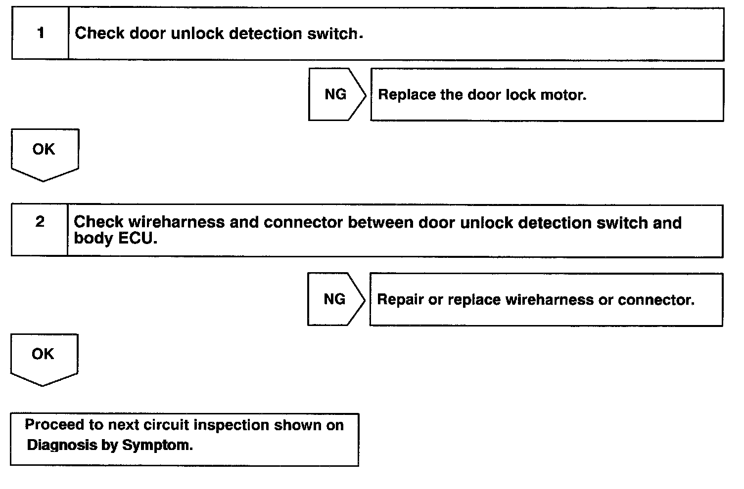 The door unlock detection switch is built in the door lock motor assembly. This switch is ON when the door lock knob is in the unlock position and OFF when the lock knob is in the lock position. The ECU detects the door lock knob conditions is this circuit. It is used as one of the operating conditions for the key confinement prevention function.