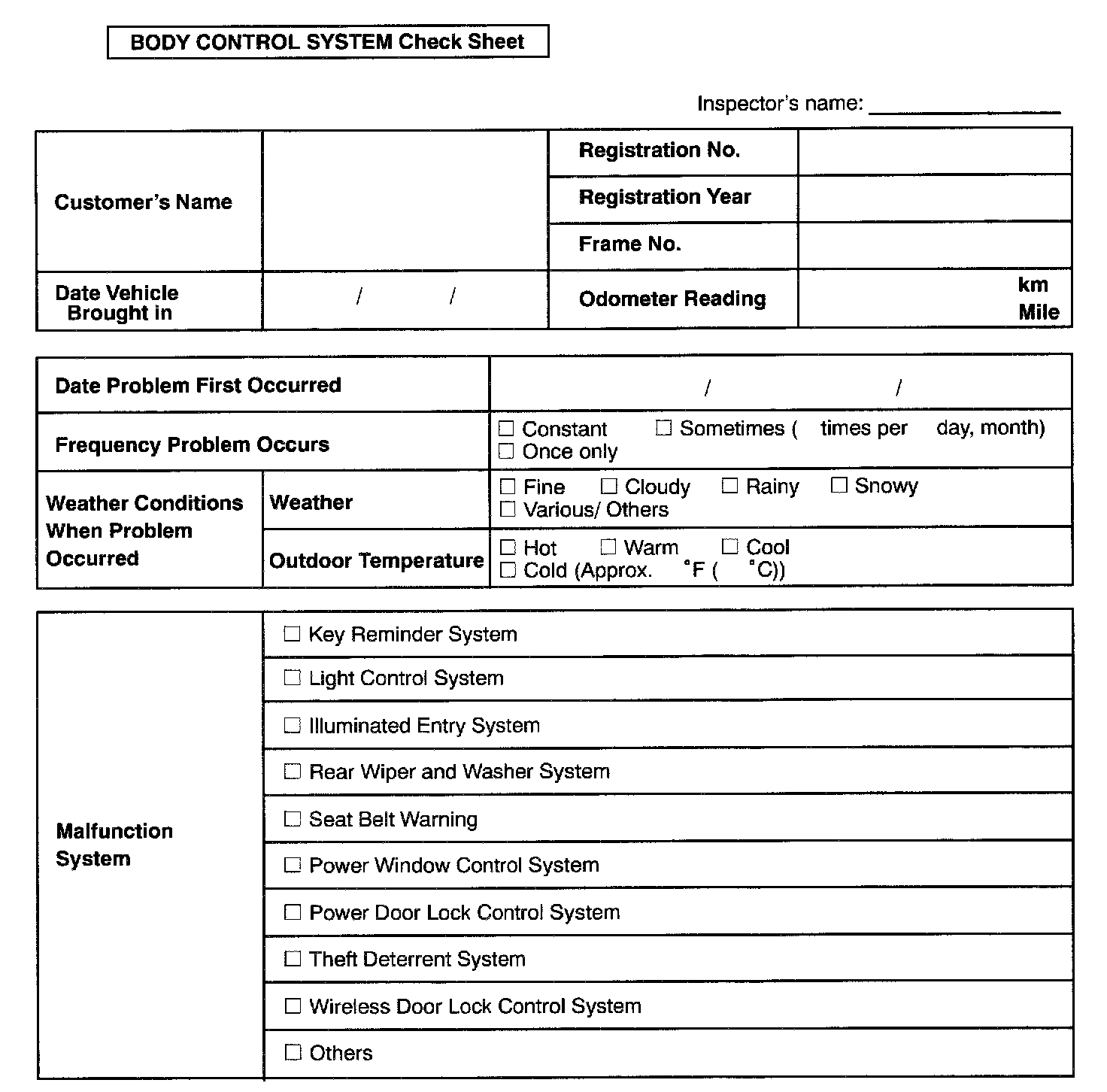 Body Control System Check Sheet: