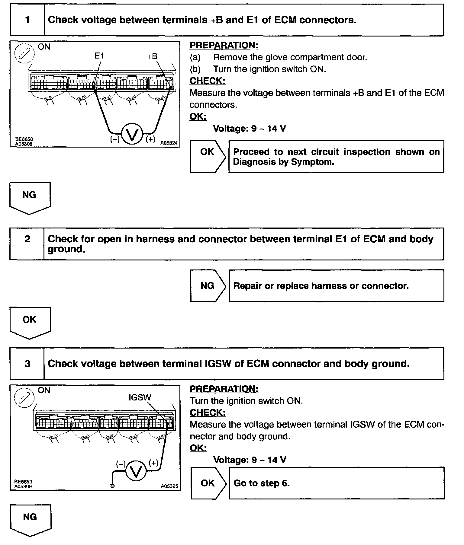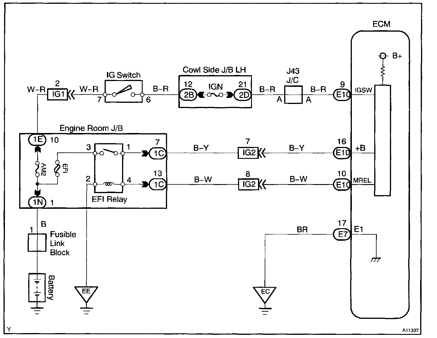 This signal causes current to flow to the coil, closing the contacts of the EFI main relay and supplying power to terminal +B of the ECM.