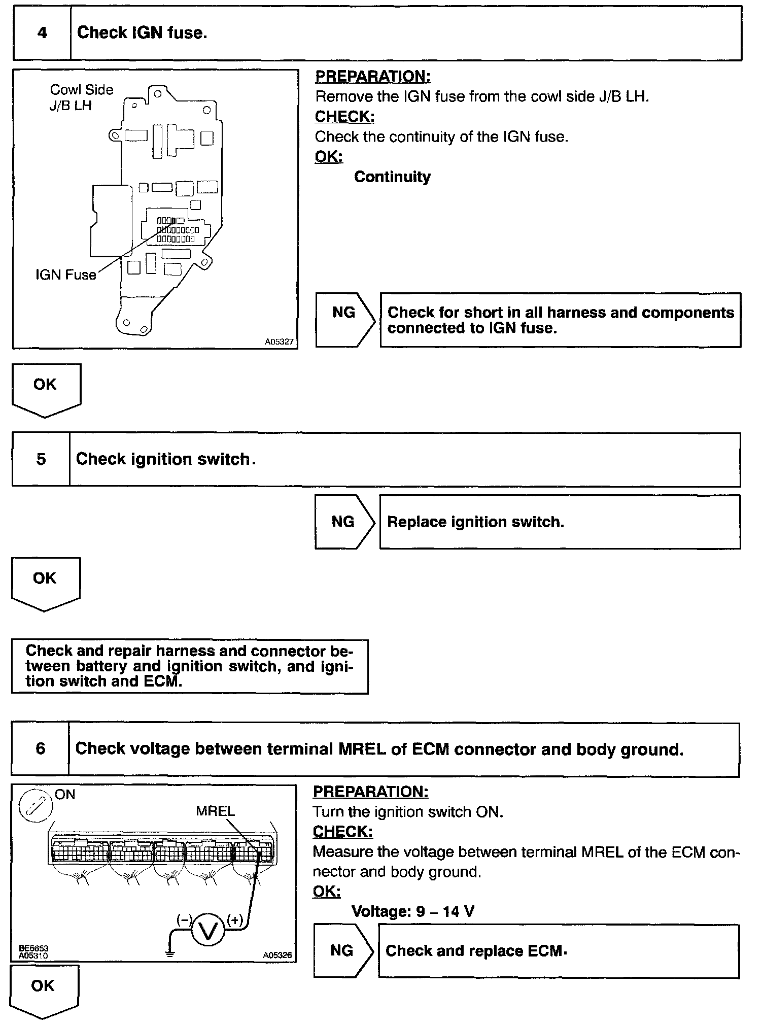 When the ignition switch is turned ON, battery positive voltage is applied to terminal IGSW of the ECM and the EFI main relay (Marking: EFI) control circuit in the ECM sends a signal to terminal MREL of the ECM switching on the EFI main relay.