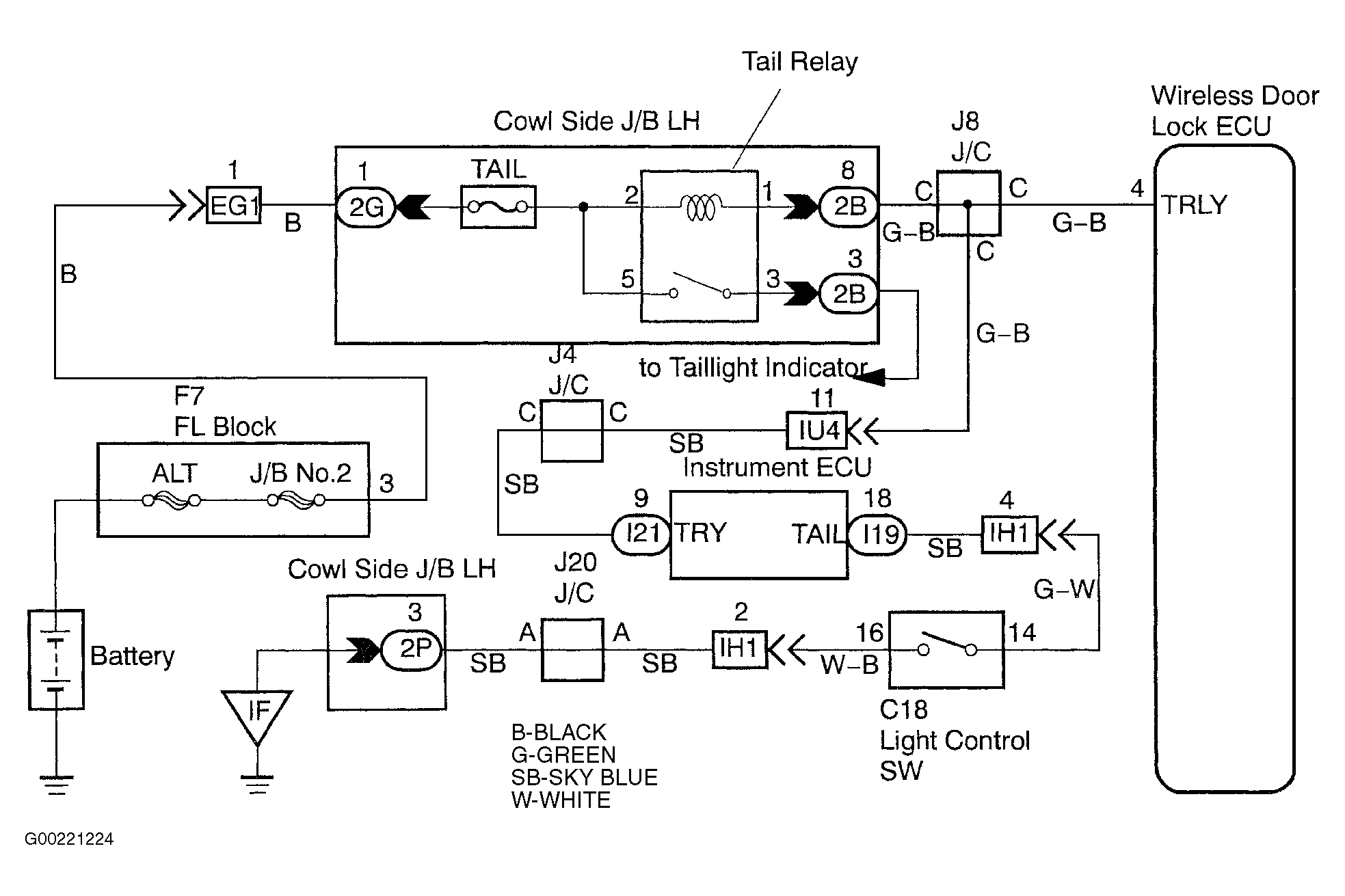 terminal No. 4 (TRLY) of the wireless door lock ECU outputs the signal once when pressing the LOCK switch of the transmitter and twice when pressing the UNLOCK switch and then makes the taillight come to light. See Fig 1.