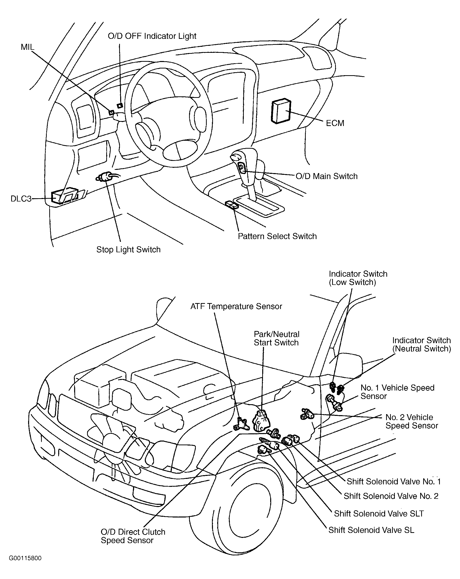 ECM receives information from various input devices and uses this information to control No. 1 and No. 2 solenoids on transmission valve body for transmission shifting, SL solenoid for torque converter clutch lock-up and SLT solenoid to provide smooth transmission shifting. ECM contains a self-diagnostic system, which will store a DTC if a failure or problem exists in the electronic control system. DTC can be retrieved to determine problem area. See SELF DIAGNOSTIC SYSTEM . Note location of ECM. See Figure.