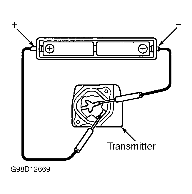 Open transmitter and remove battery. Connect 2 new 1.5-volt dry-cell batteries in series. See Fig 1. Connect battery positive terminal to battery receptacle side terminal and battery negative terminal to bottom terminal to provide 3 volts to transmitter. Attempt to operate door lock by remote control. If door locks operate, replace battery. If door locks do not operate, replace transmitter and reprogram. See PROGRAMMING .