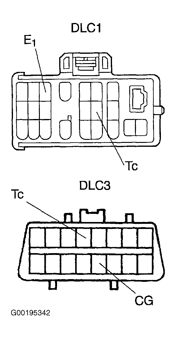 9. Stop vehicle. Using special tool (09843-18020 or 18040), jumper between terminals Tc and E1 of (DLC1) or Tc and CG of (DLC3). See Figure.