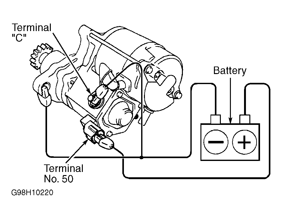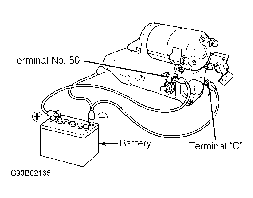 Disconnect field coil lead from terminal "C". Connect jumper wires from negative battery terminal to terminal "C" and to starter housing. When wire is connected from positive battery terminal to terminal No. 50, clutch pinion gear should extend fully. See Fig 1 or Fig 4 . If clutch pinion gear does not move, replace solenoid. If clutch pinion gear does move, go to next test. - Hold-In Coil Test