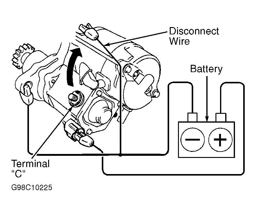 With battery connected as in previous test and clutch pinion gear still extended, disconnect jumper wire from starter terminal "C". See Fig 2 or Fig 5 . Clutch pinion gear should remain extended. If clutch pinion gear does not remain extended, replace solenoid. If clutch pinion gear does remain extended, go to next test. - Drive Pinion Return Test