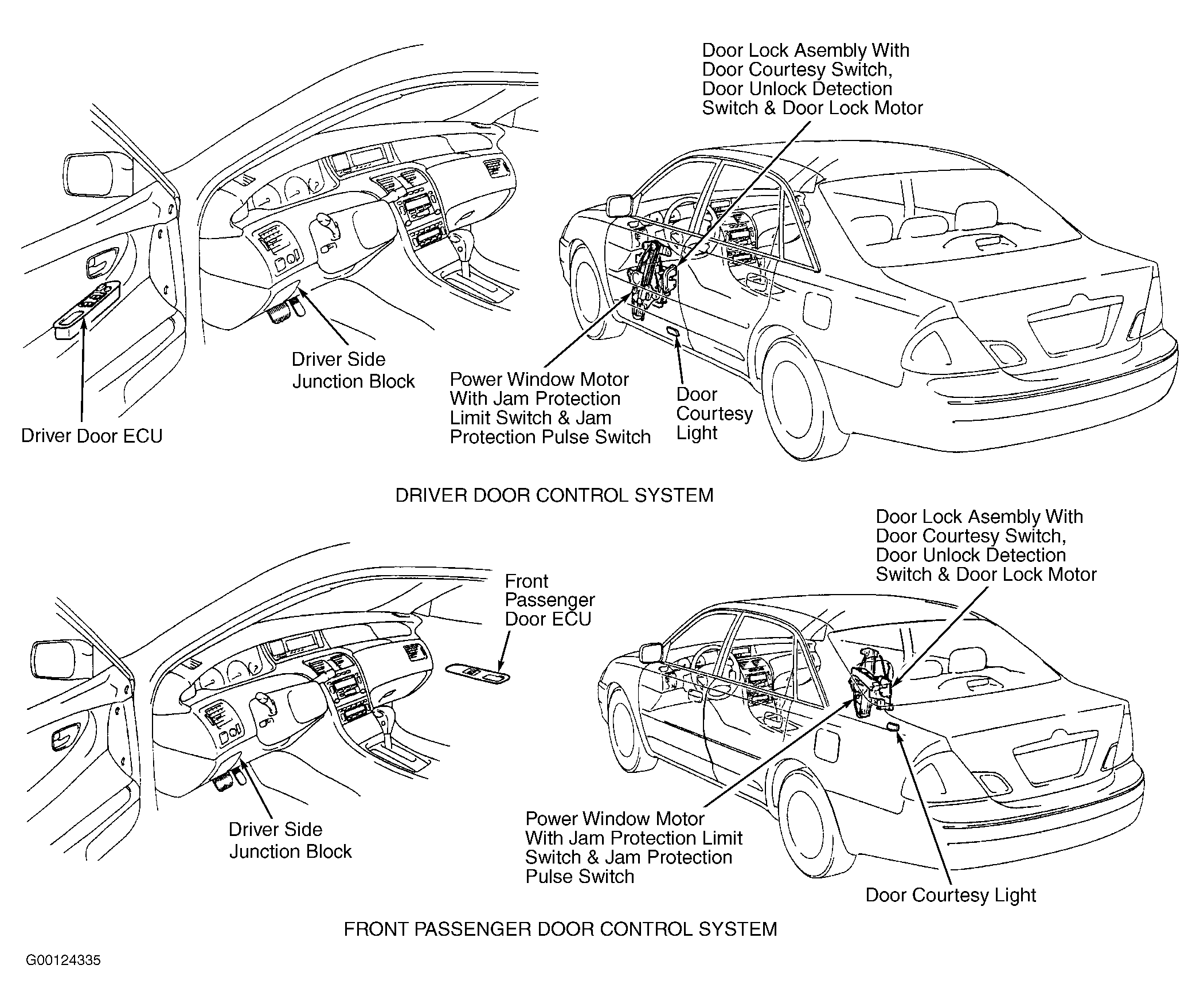 2. Check DOOR NO. 1 fuse (25-amp). DOOR NO. 1 fuse is located in driver side junction block located under left side of instrument panel. See Figure. If DOOR NO. 1 fuse is okay, go to next step. If DOOR NO. 1 fuse is defective, replace fuse and repair wiring harness or electrical connector on wiring circuit as necessary. See BODY COMPUTER in SYSTEM WIRING DIAGRAMS article. After repairs, perform confirmation test. See CONFIRMATION TEST .