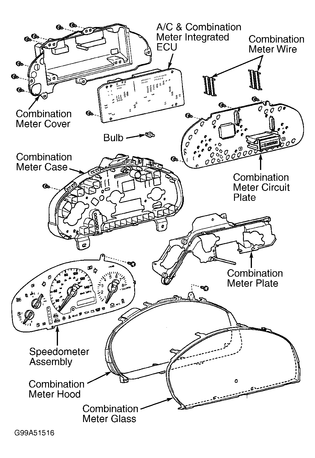 | A/C & Combination Meter Integrated ECU | Inside instrument cluster assembly. See Figure. |