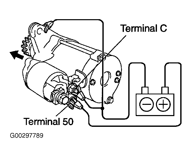 2. Clip ground to terminal "C" and the main body of the starter, connect the battery to the magnetic switch (terminal No. 50). Ensure that the clutch pinion gear moves outward. See Fig 1.