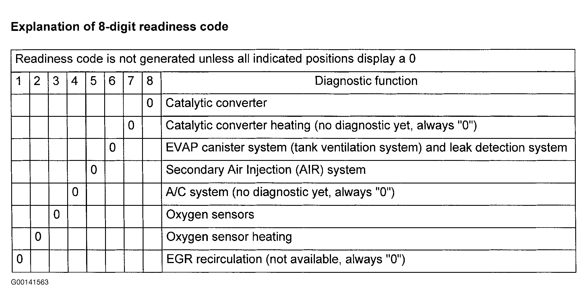 3. After clearing DTC memory. Follow scan tool instructions to complete generating readiness code. During test sequence if test is successful scan tool changes display digits from 1 to 0. See Fig 1. Readiness code should display 0 0 0 0 0 0 0 0. If readiness code displays as specified, testing is complete.
