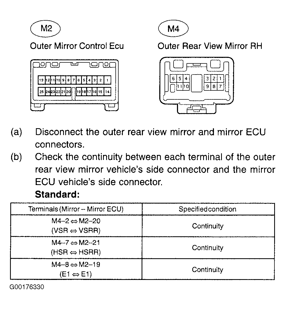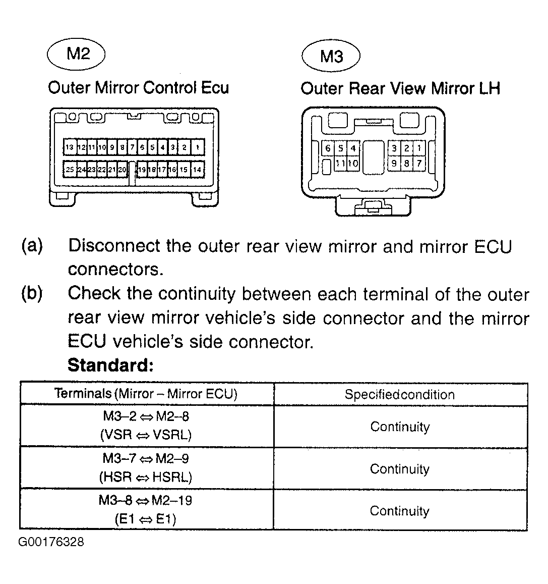 - Check the outside rear view mirror control ECU and left hand outside rear view mirror wiring harness. See Fig 3. If the continuity is OK, replace the outside rear view mirror control ECU assembly. See COMPONENT LOCATIONS . If the continuity is not OK, repair or replace the wiring harness or connector.