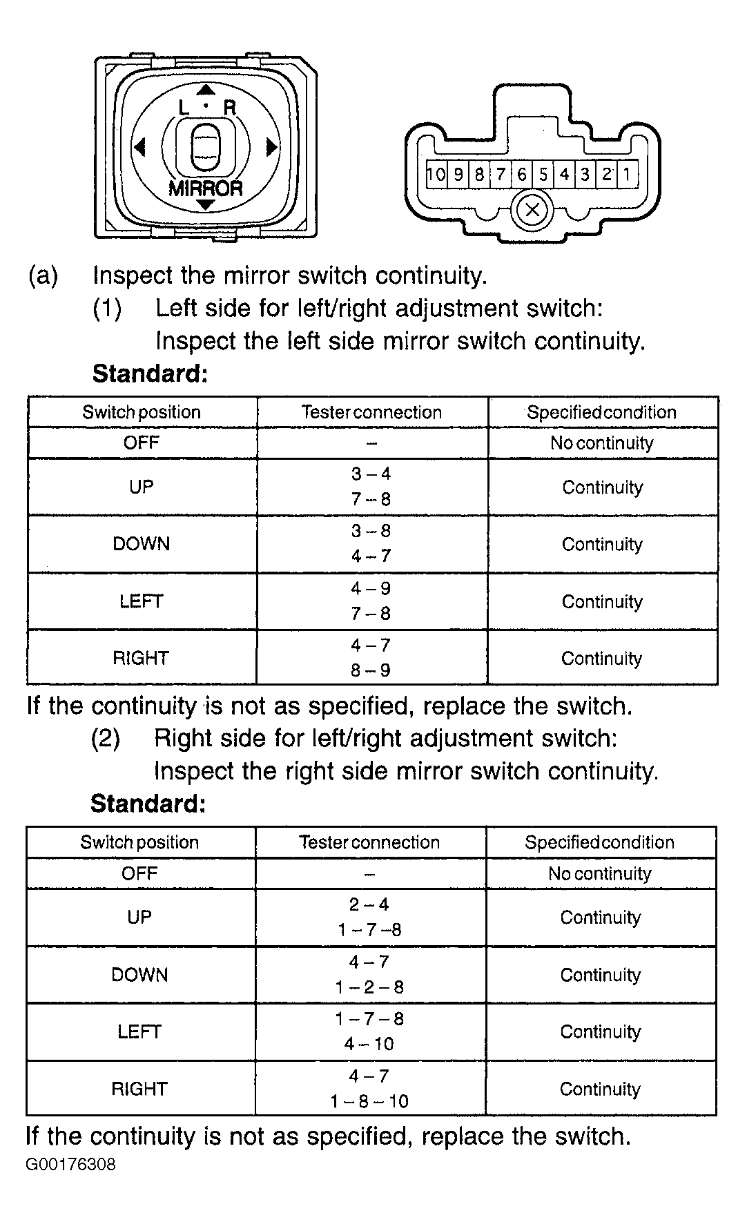 - Inspect the outside rear view mirror switch assembly. See Figure. If the switch is OK, go to the next step. If the switch is not OK, replace the outside rear view mirror switch assembly.
