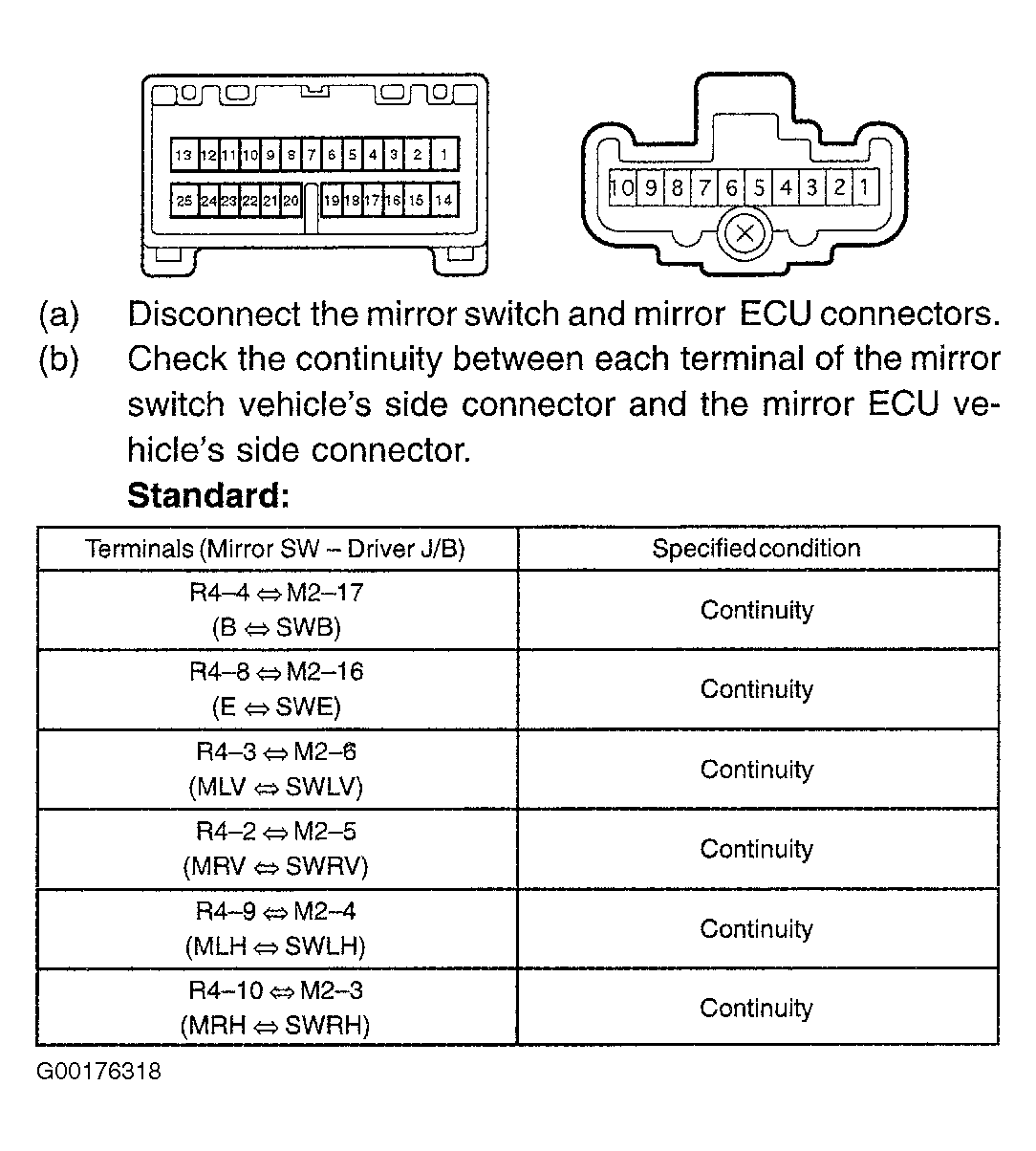 - Check the mirror switch and mirror ECU wiring harness. See Fig 1. If the connectors are OK, replace the outside rear view mirror control ECU assembly. If the connectors are not OK, repair or replace the wiring harness or connector.