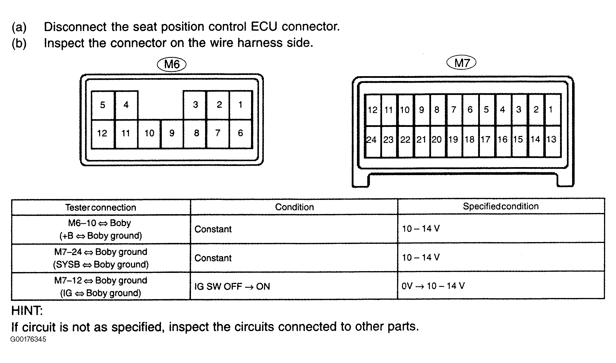 - Check the source voltage. See Fig 2. If the results are OK, check and replace the position control ECU assembly. See POSITION CONTROL ECU ASSEMBLY under REMOVAL & INSTALLATION. If the results are not good, repair or replace the harness and connector.