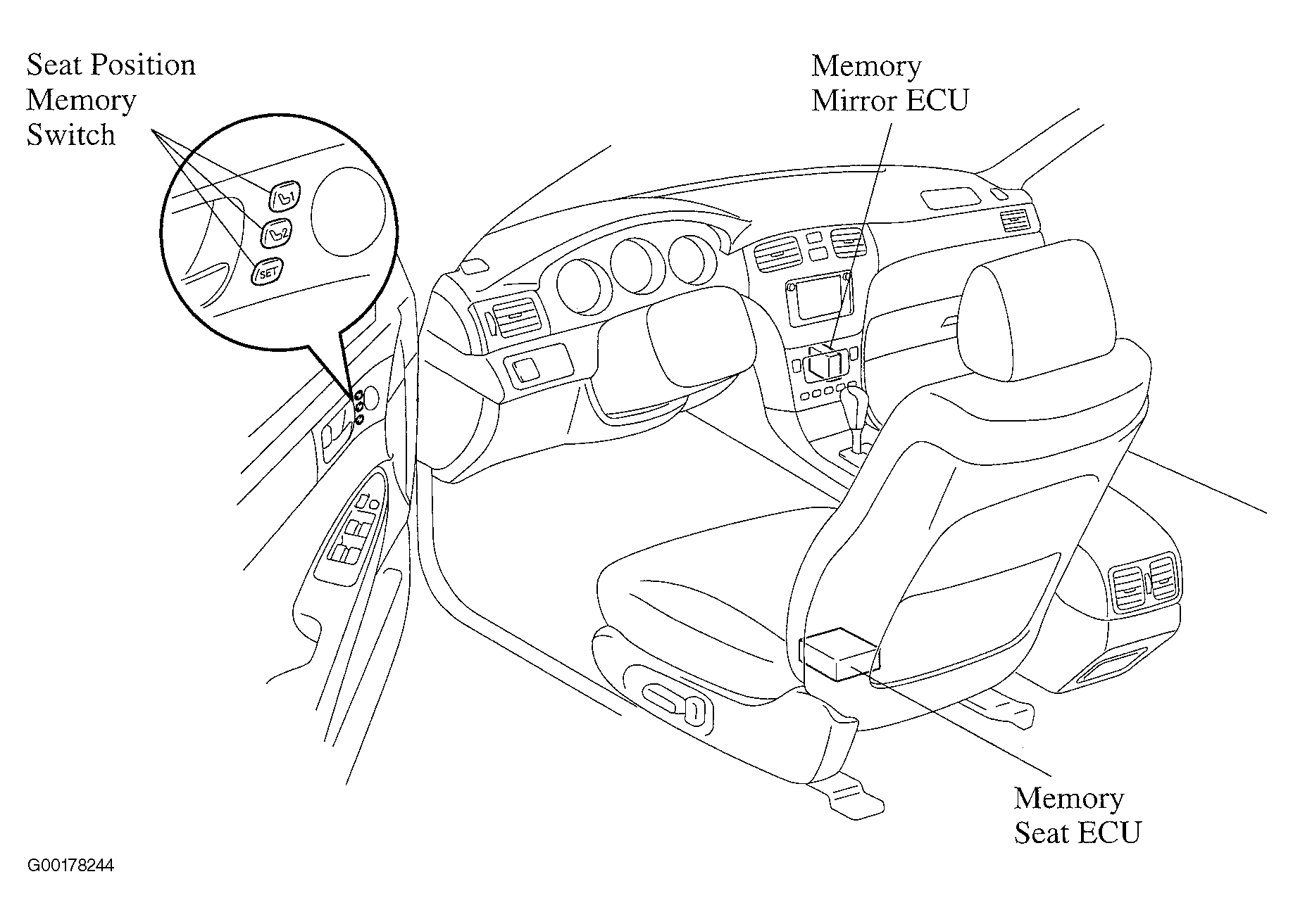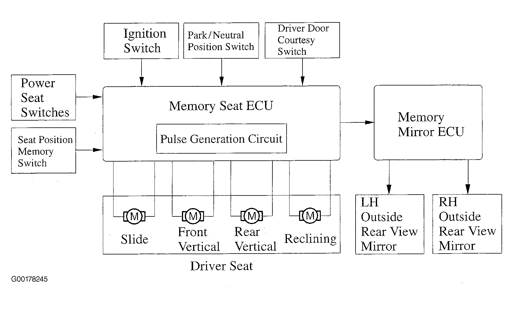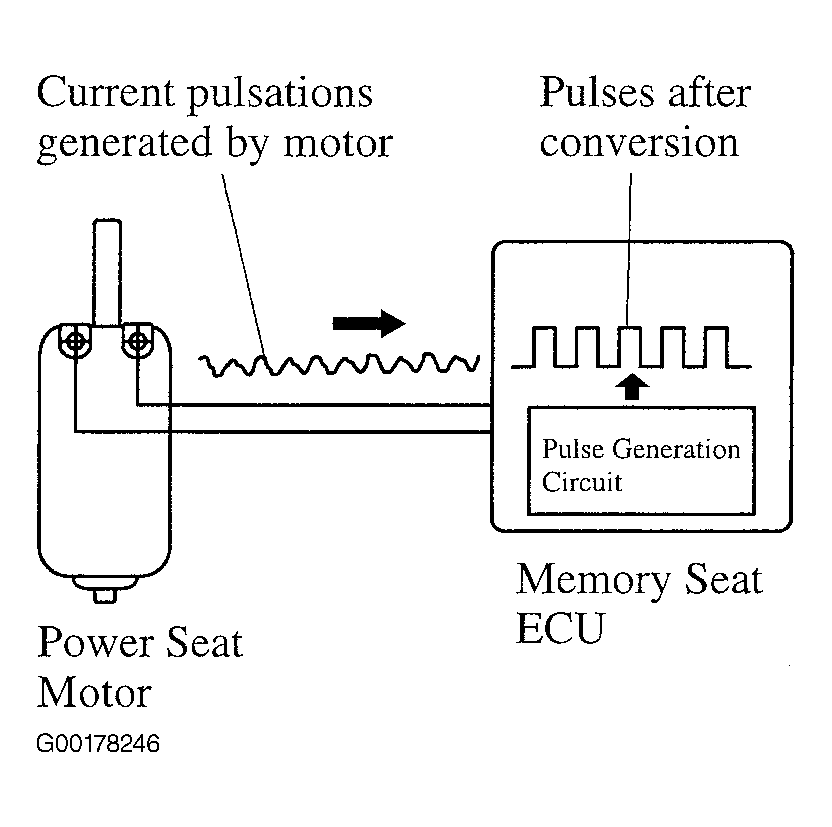 The memory seat ECU effects control by memorizing 2 seat positions and outside rear view mirror position. See Fig 1. There is a mechanism to detect the seat position, in which the memory seat ECU converts the driving current pulsations generated by the rotation of the motor into pulse signals. See Fig 2.