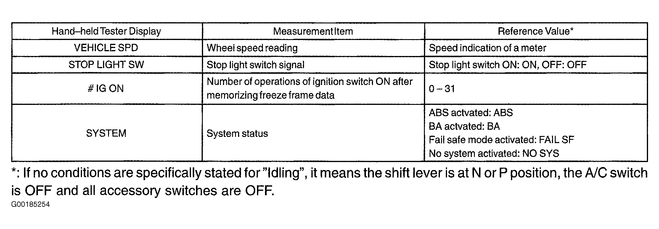 The vehicle (sensor) status at time of malfunction, and during ABS operation can be memorized and displayed using hand-held tester. Only one record of freeze frame data is stored. However, freeze frame data during ABS operation is constantly updated. After storage of freeze frame data, up to 31 ignition ON operations are stored and displayed. If ignition switch ON operation exceeds 31 times, "31" appears on the display. See Fig 1.