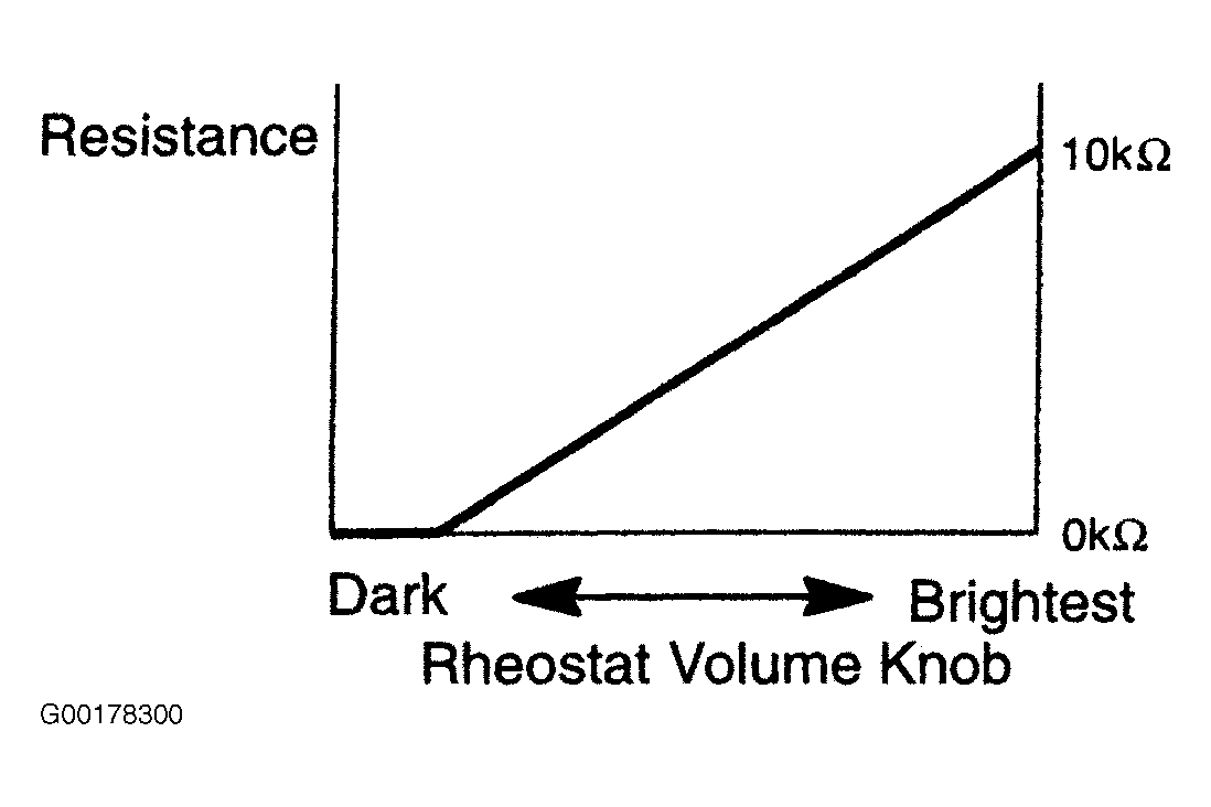 1. Check the continuity between the connector terminals when operating the rheostat volume knob. For connector view, see CONNECTOR IDENTIFICATION . See RHEOSTAT VOLUME KNOB STANDARD CONTINUITY  table.
