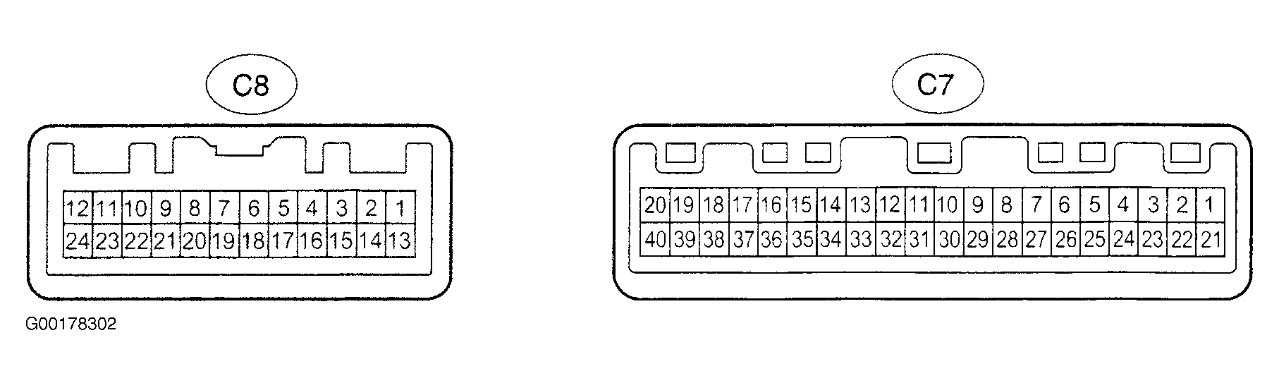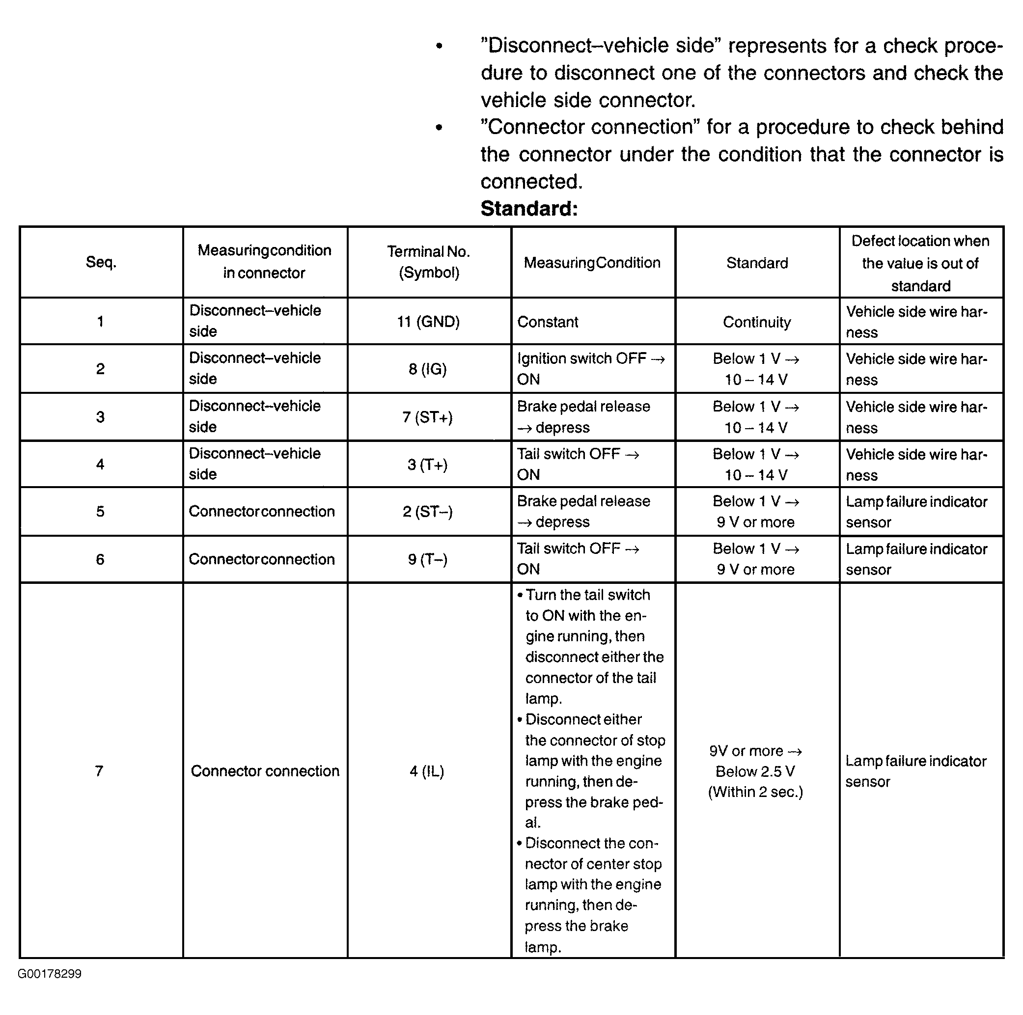 14. Inspect the lamp failure indicator sensor. Check the standard signal. Check the voltage and the continuity between each terminal and body ground. For connector view, see CONNECTOR IDENTIFICATION . See Fig 1.