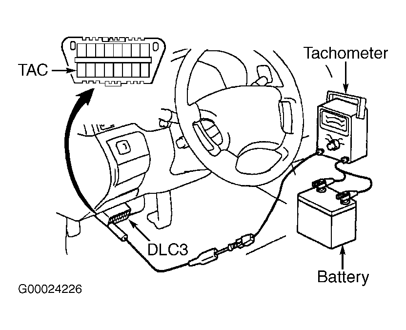 1. Remove intake manifold cover located on top of engine. Start and warm engine up to normal operating temperature. Shut engine off. Connect tachometer to DLC3. See Fig 1.