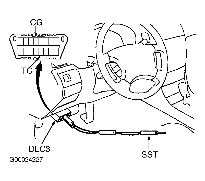 3. Apply parking brake. Place transmission in Neutral. Start engine and maintain engine at 2500 RPM for 90 seconds and allow engine to idle. Ensure idle speed is 700-800 RPM. Install Jumper Wire (SST 09843-18040) between terminals TC and CG on DLC3. See Fig 2.