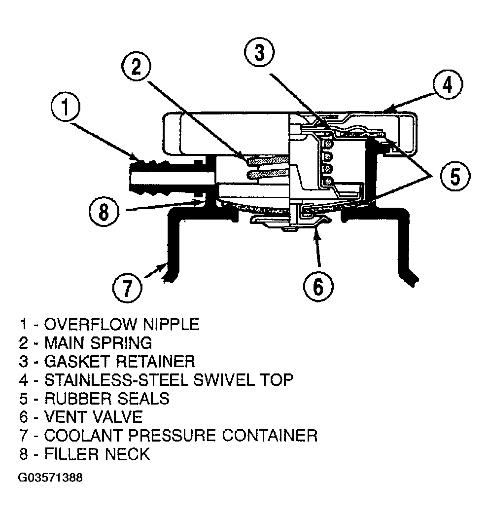 Hold the cap in your hand, right side up (Figure ). The vent valve at the bottom of the cap should be normally closed. The vent valve should open with a slight pull with your finger nail. Replace the pressure cap for any of the following: