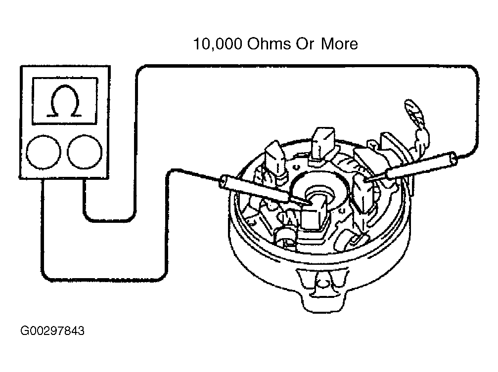 2. Using an ohmmeter, measure resistance between the positive and negative brush holders. See Fig 2. Verify resistance is within specification. See STARTER SPECIFICATIONS . If resistance is not within specification, repair or replace the starter commutator end frame assembly.