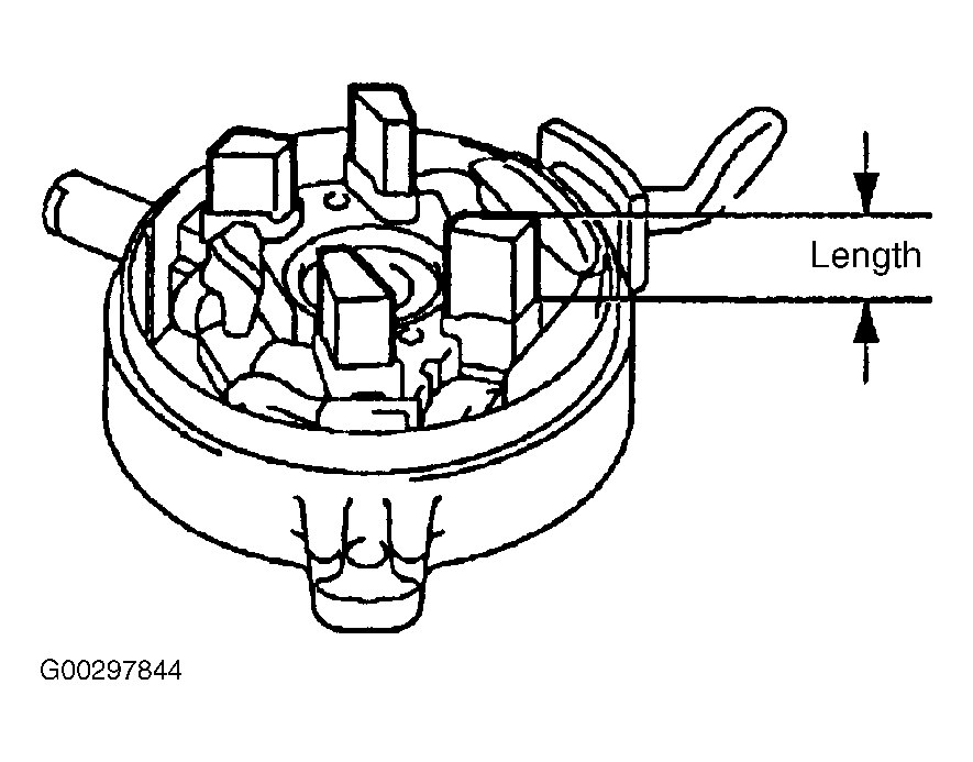 1. Using vernier calipers, measure the brush length. See Fig 1. Verify length is within specification. See STARTER SPECIFICATIONS . If the length is less than minimum, replace the starter commutator end frame assembly.