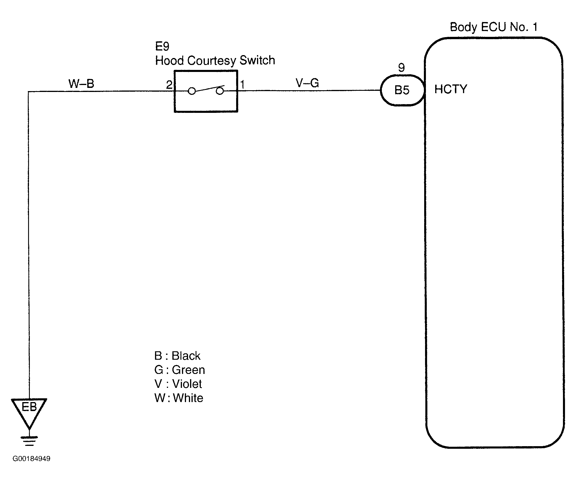 - Check for short to power, short to ground and continuity in the wiring harness and connector between the engine hood courtesy switch and body ECU No. 1. If the results are OK, perform the next test procedure of the problem symptom. See BODY ECU NO. 1 PROBLEM SYMPTOM INDEX table. If the results are not OK, repair or replace the wiring harness or connector.