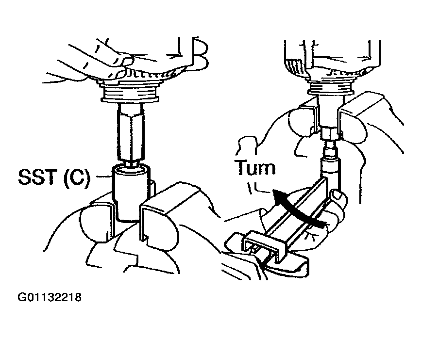 - Insert SST (B) into SST (C), and attach the pulley nut to SST (C).