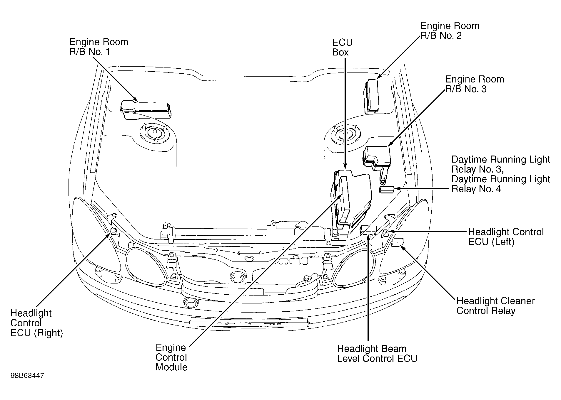 Headlight Beam Level Control ECU At left front corner of engine compartment. See Figure.