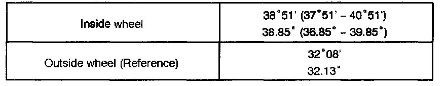 Turn the steering wheel fully and measure the turning angle. If the wheel angles differ from the standard of the specification, inspect the toe-in.
