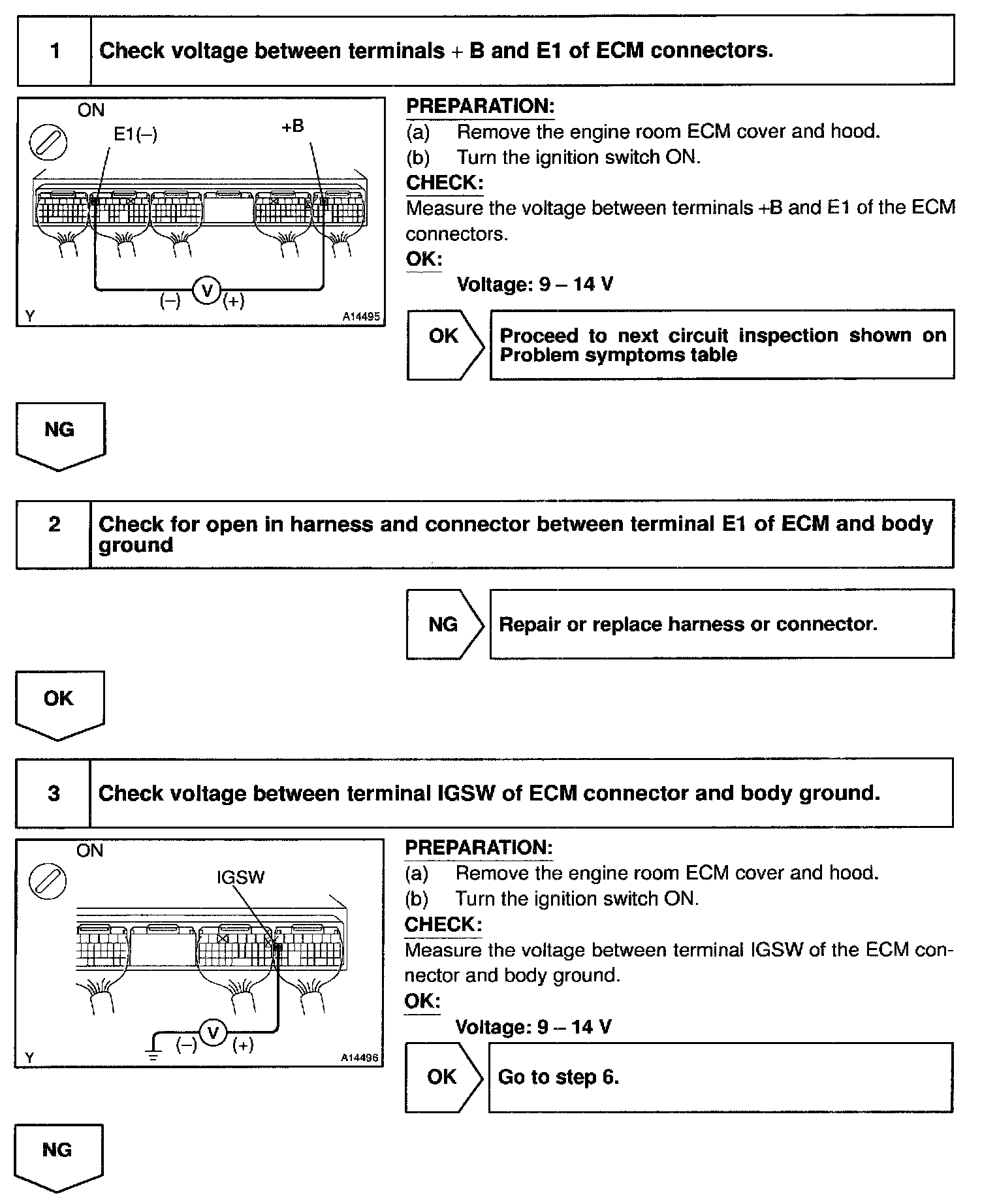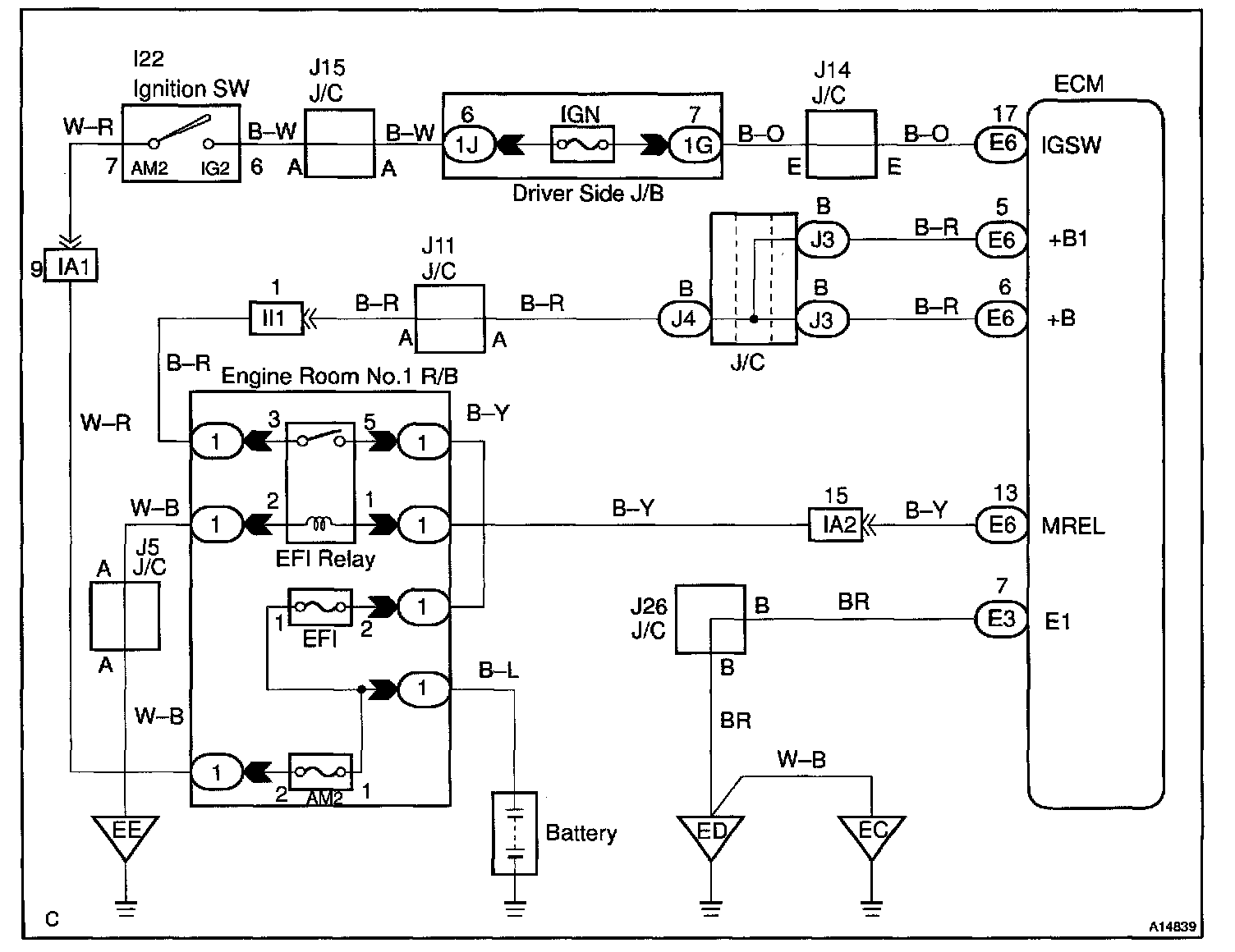 This signal causes current to flow to the coil, closing the contacts of the EFI main relay and supplying power to terminal +B of the ECM.