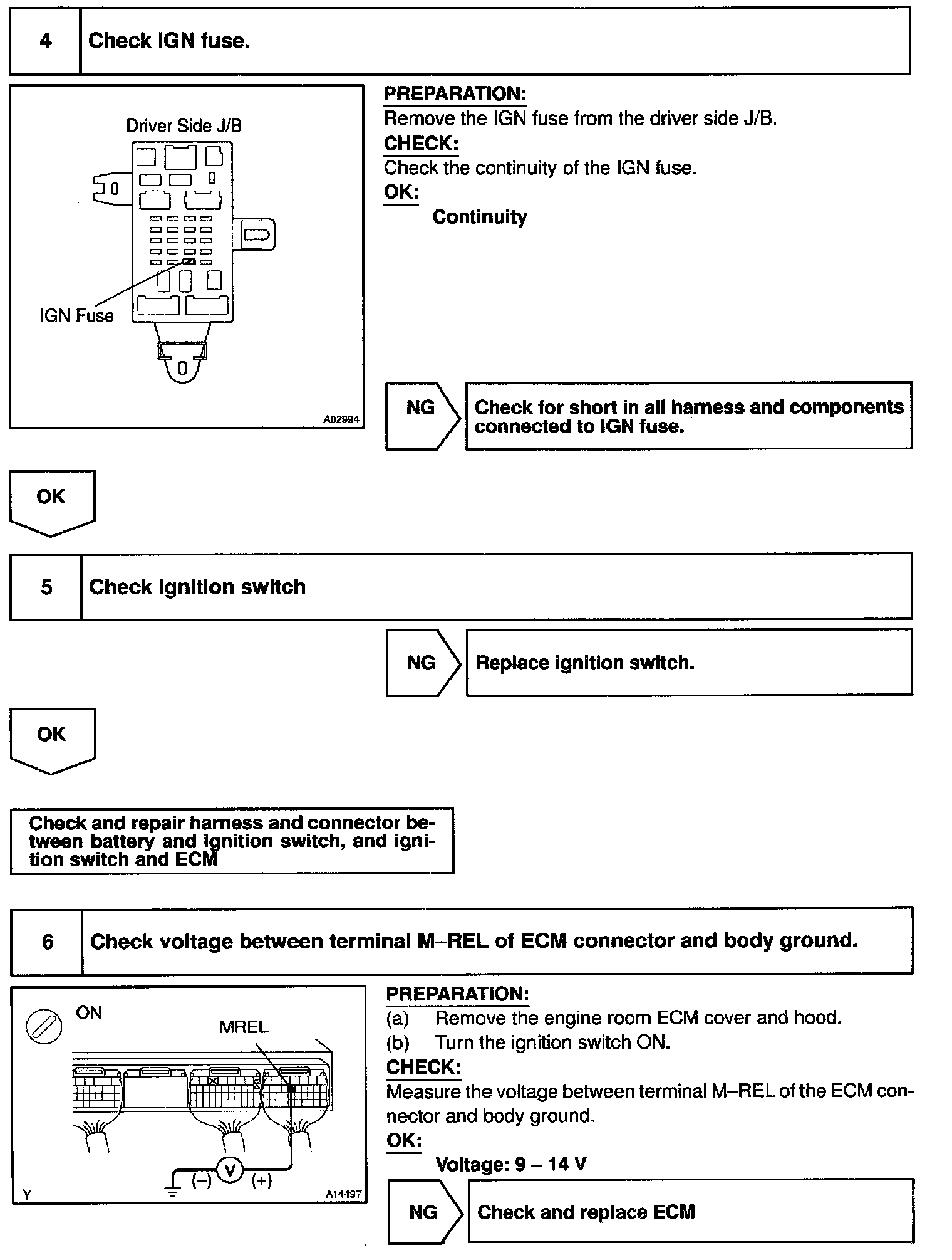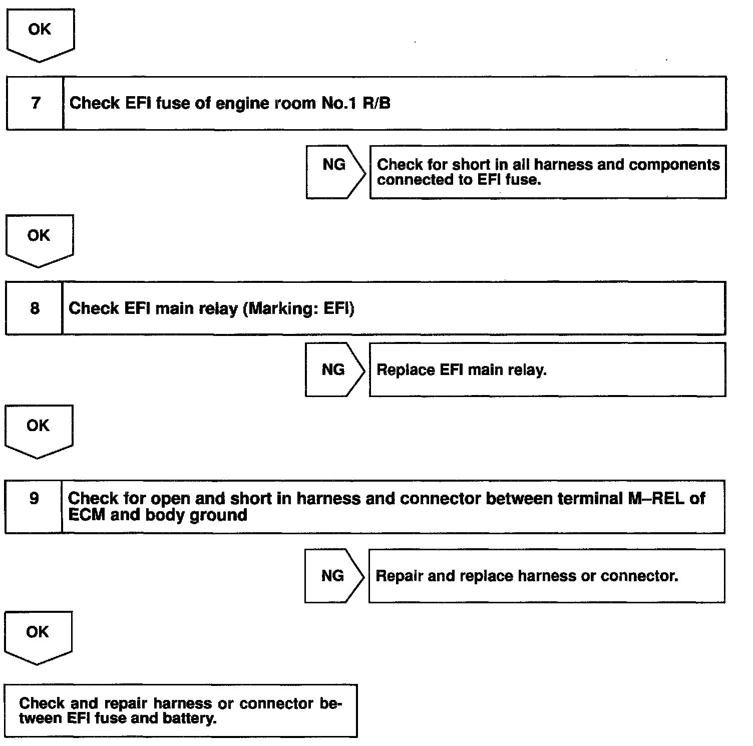 When the ignition switch is turned ON, battery positive voltage is applied to terminal IGSW of the ECM and the EFI main relay (Marking: EFI) control circuit in the ECM sends a signal to terminal MREL of the ECM switching on the EFI main relay.