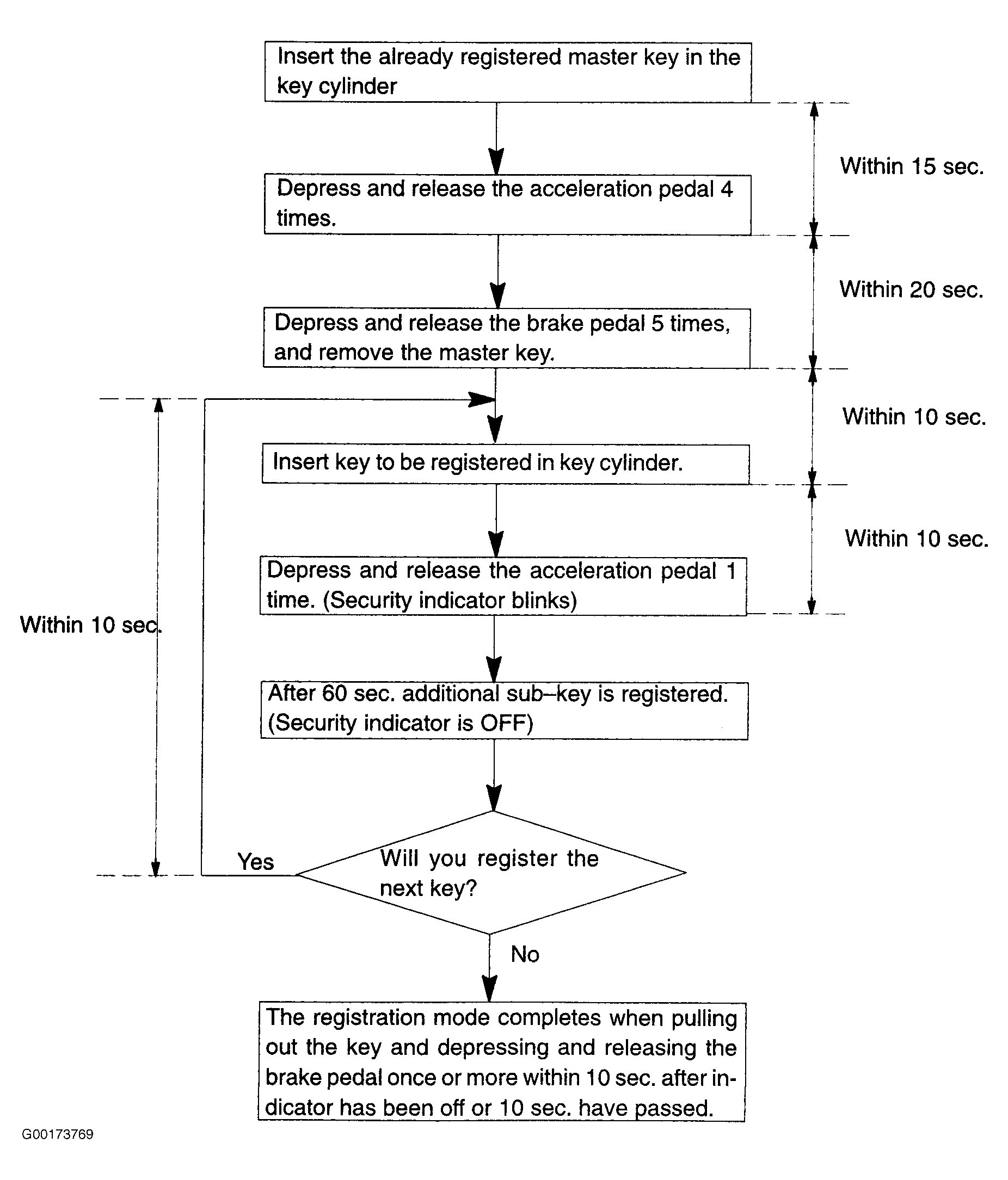 There are 2 ways for registration of an additional sub-key, one way is depressing the brake pedal and acceleration and the other way is using the hand-held tester. When using the brake and accelerator pedal for additional sub-key registration, refer to flowchart. See Fig 1. When using the hand-held tester for additional sub-key registration, refer to flowchart. See Fig 2.