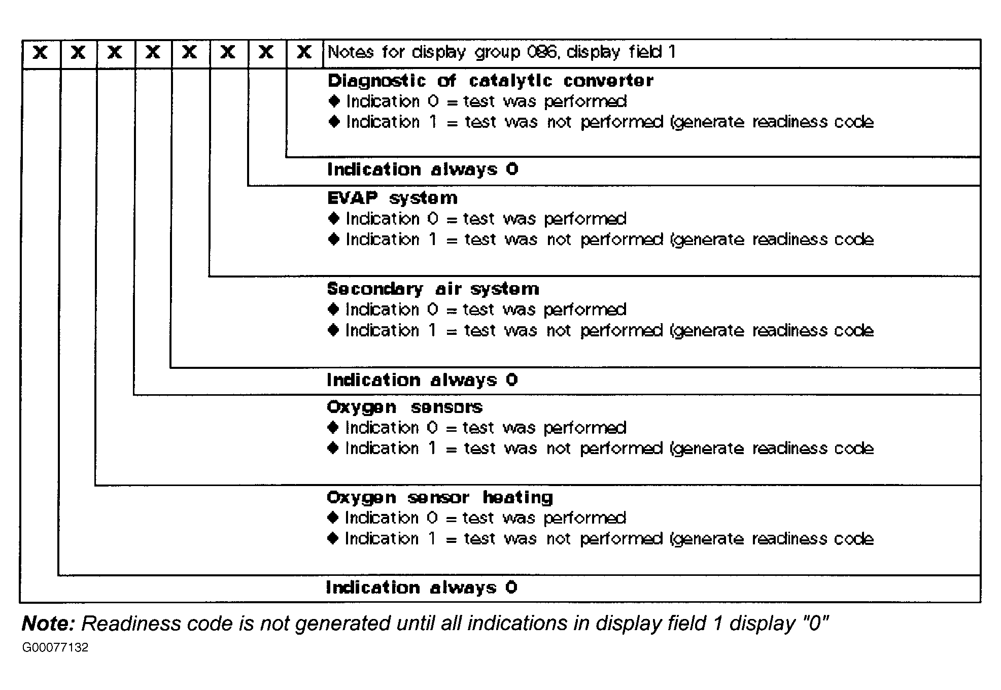 Readiness code must be generated when Engine Control Module (ECM) memory is cleared, battery voltage or ECM is disconnected. Readiness code appears on scan tool as an 8-digit display in display field 1 of MEASURING VALUE BLOCK - 086. Each of the 8 digits is related to a specific exhaust related system. During a test sequence OBD system checks function of each of the 8 systems. Test sequence once started must be run completely. During test sequence if test is successful scan tool changes display digits from "1" to "0". When readiness code is generated, display should read 0 0 0 0 0 0 0 0 in display field 1 of measuring value block 086. If during testing, a malfunction is recognized, a DTC is stored in memory. Retrieve DTCs and repair as necessary. See RETRIEVING DIAGNOSTIC TROUBLE CODES under SELF-DIAGNOSTICS SYSTEM in appropriate SELF DIAGNOSTICS article.