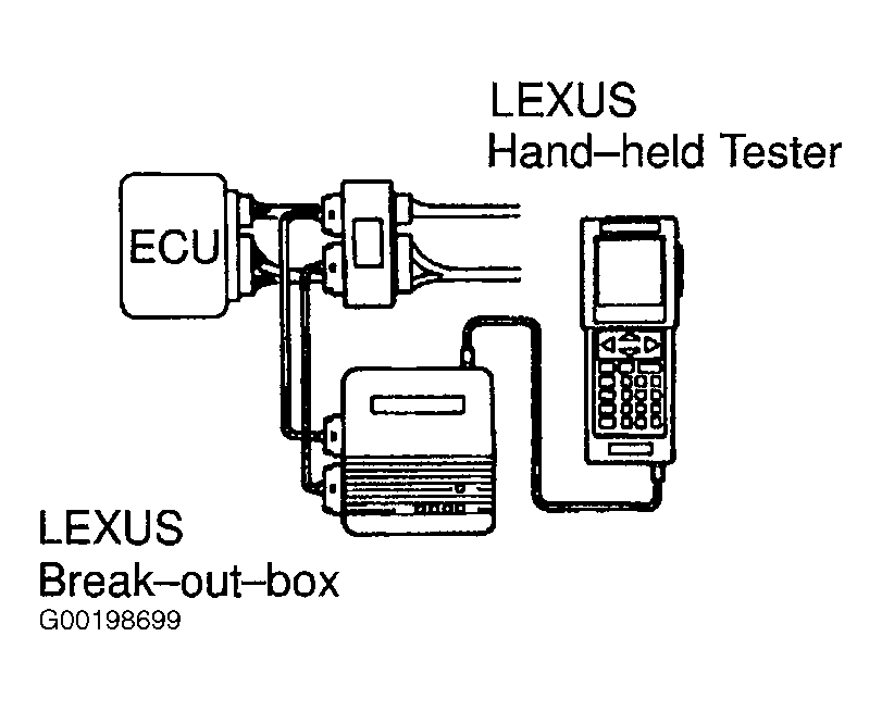 - Turn ignition switch off. Connect LEXUS break-out-box and LEXUS hand-held tester to vehicle. See Fig 1.
