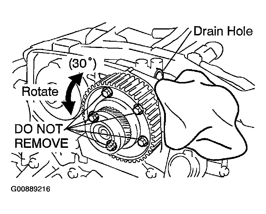 1. Rotate the VVT-i pulley from left to right 2 to 3 times within its range of movement (30°) and use a waste cloth to collect the oil from the camshaft timing oil control valve installation hole.
