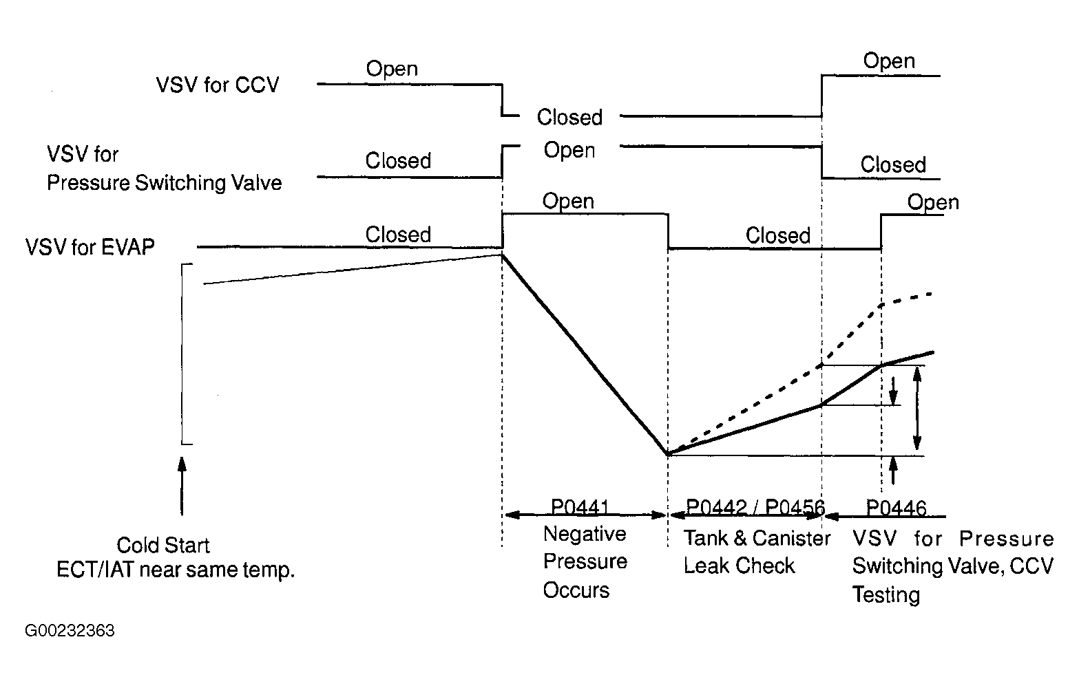 The vapor pressure sensor, VSV for canister closed valve (CCV), and VSV for pressure switching valve are used to detect abnormalities in the evaporative emission control system. The ECM decides whether there is an abnormality in the evaporative emission control system based on the pressure sensor signal. DTCs P0441 and P0446 are recorded by the ECM when evaporative emissions leak from the components noted within the dotted line or when there is a malfunction in either the VSV for EVAP, the VSV for pressure switching valve, or in the vapor pressure sensor itself. See Fig 2.