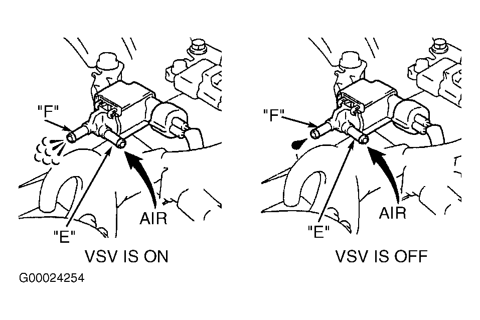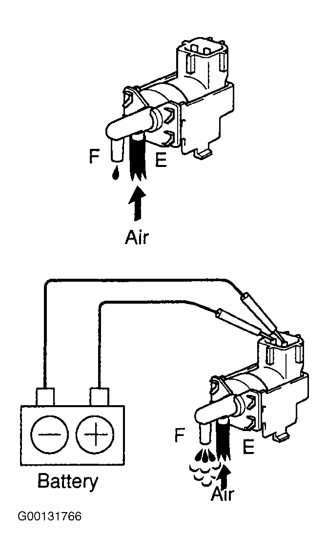 - Remove EVAP VSV. Using ohmmeter, measure resistance between VSV terminals. With VSV temperature at 68°F (20°C), resistance should be 30-34 ohms. Measure resistance between each terminal and body of valve. Resistance should be infinite. If resistance is as specified, using fused jumper wires, apply battery voltage and ground to EVAP VSV terminals. Apply compressed air to EVAP VSV port "E". Air should flow from port "F". See Figure. Disconnect fused jumper wires. Air should not flow from port "F". If EVAP VSV does not operate as specified, or if resistance was not as specified, replace EVAP VSV and charcoal canister. After replacing components, clean vacuum hoses between EVAP VSV and throttle body, and between EVAP VSV and charcoal canister. If EVAP VSV operates as specified, go to next step. Replace as necessary. If okay, go to next step.