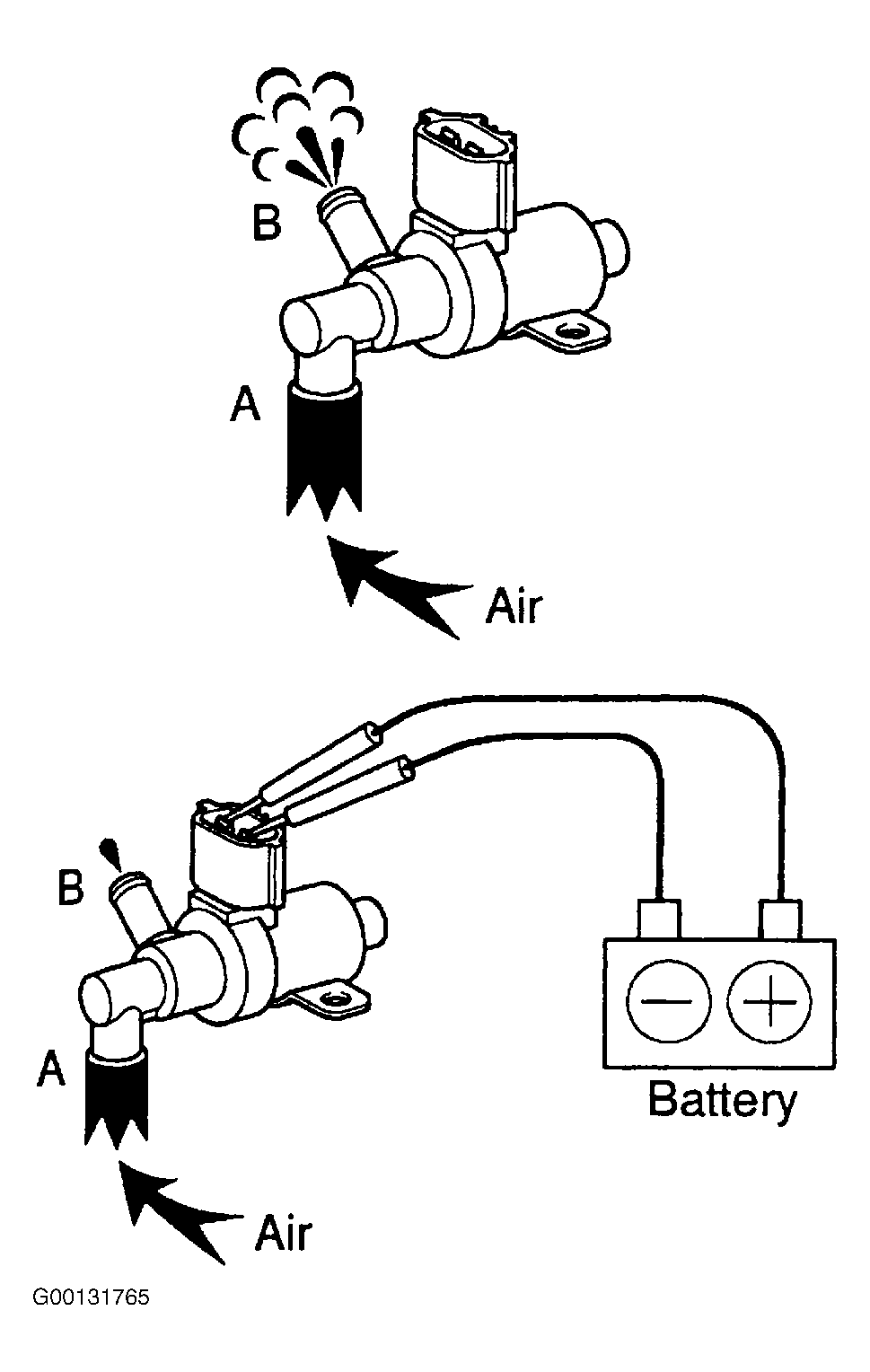 - Check canister closed valve VSV. Using ohmmeter, measure resistance between VSV terminals. With VSV temperature at 68°F (20°C), resistance should be 25-30 ohms. Measure resistance between each terminal and body of valve. Resistance should be infinite. If resistance is as specified, apply air to EVAP VSV port "A". Air should flow from port "B". See Figure. Using fused jumper wires, apply battery voltage and ground to VSV terminals. No air should flow from port "B". If VSV does not operate as specified, or if resistance was not as specified, replace VSV. If VSV is okay, go to next step.