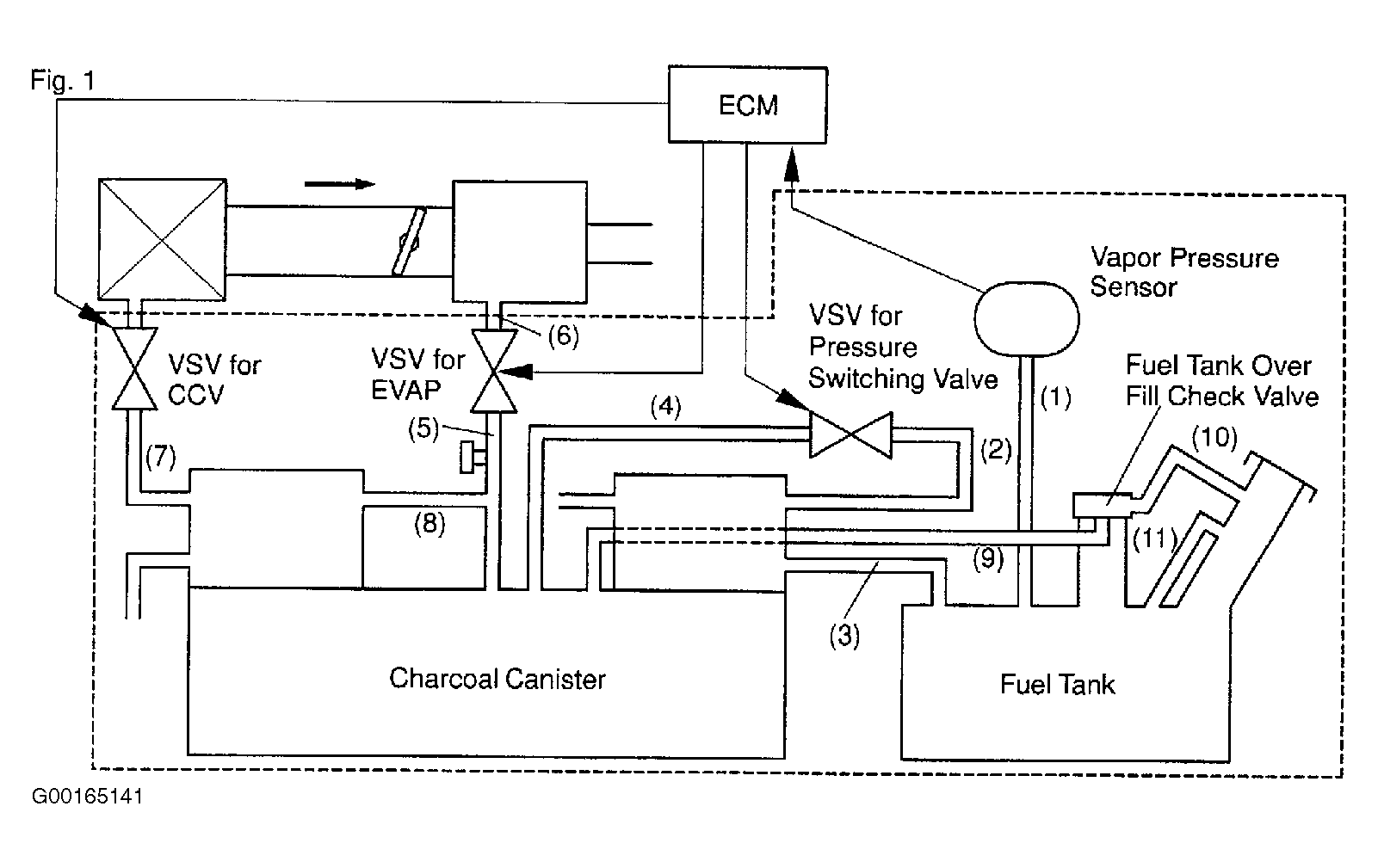 - Select the ENHANCED OBD2/ACTIVE TEST mode on the hand-held tester. Disconnect the vacuum hose for the VSV for the EVAP from the charcoal canister. Start the engine. Select the item EVAP VSV (ALON)/ALL in the ACTIVE TEST and operate EVAP VSV (press right or left button). When VSV for EVAP is operated by the hand-held tester, check whether the disconnected hose applies suction to your finger. When VSV is ON, disconnected hose applies suction to your finger. When VSV is OFF, disconnected hose applies no suction to your finger. See Fig 1. If vacuum hoses are okay, go to step 10. If vacuum hoses are not okay, go to next step.