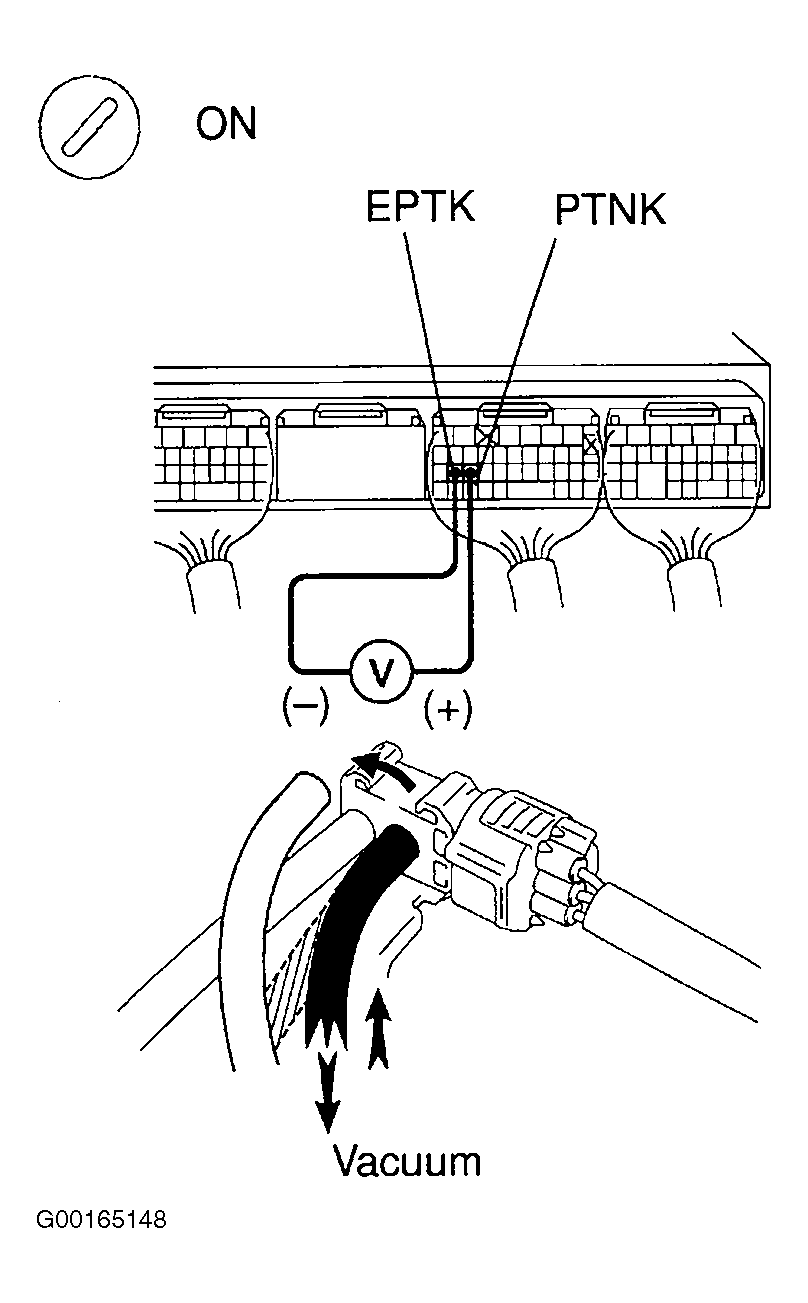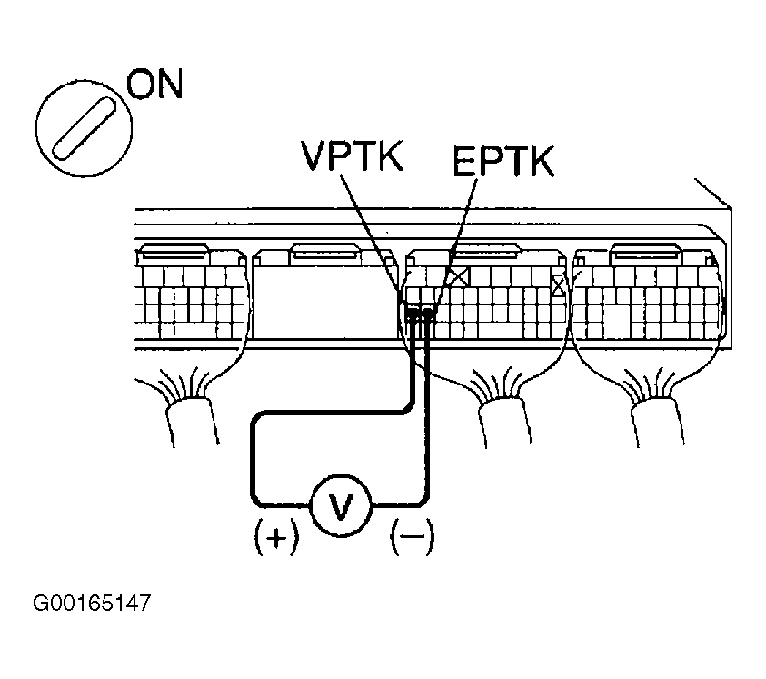 - Remove the engine room ECU cover. Turn the ignition switch ON. Measure the voltage between terminals VPTK and EPTK of ECM connector. See Fig 5. If voltage is 4.5-5.5 volts, go to next step. If voltage is not 4.5-5.5 volts, check and replace ECM.