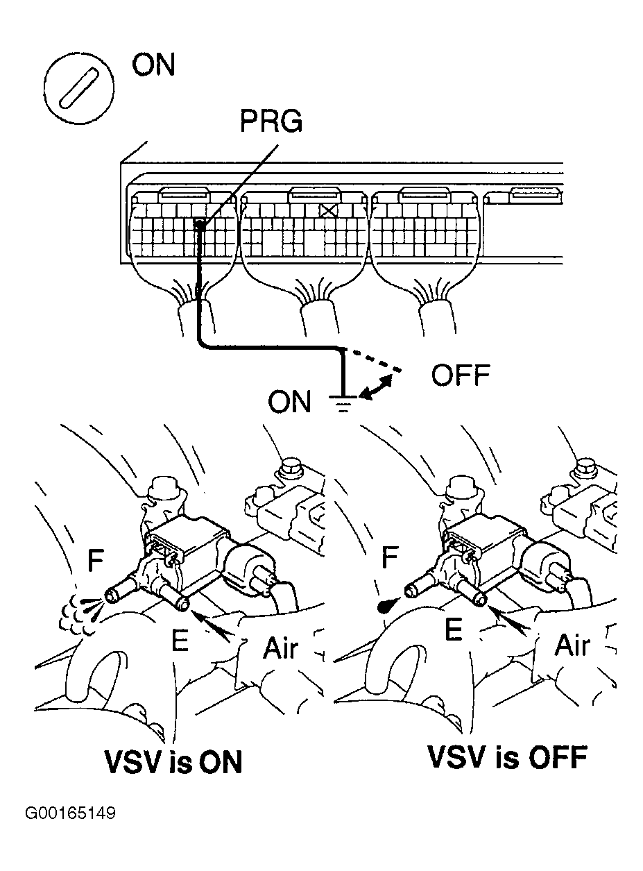 - Remove the engine room ECU cover. Turn the ignition switch ON. Check the VSV function. Connect jumper wire between terminal PRG of the ECM connector and body ground (ON). Disconnect jumper wire between terminal PRG of the ECM connector and body ground (OFF). When VSV is ON, air from port "E" flows out through port "F", When VSV is OFF, air does not flow from port "E" to port "F". See Fig 1. If okay, go to step 16. If not okay, go to next step.