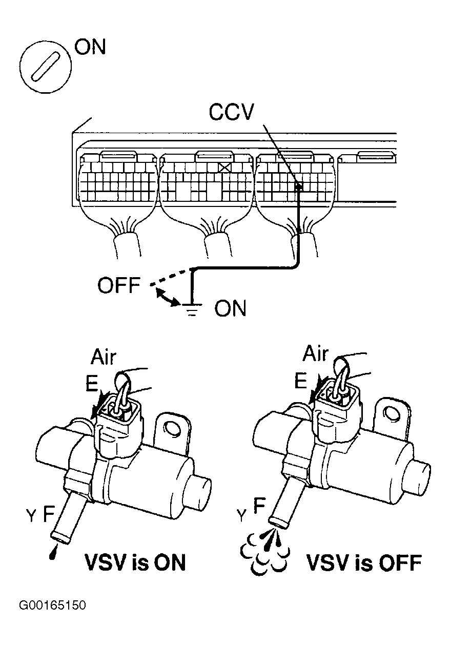 - Check VSV function by connecting a jumper wire between terminal CCV of the ECM connector and body ground (ON), then disconnect jumper wire between terminal CCV of the ECM connector and body ground (OFF). When VSV is ON, air does not flow from port "E" to port "F". When VSV is OFF, air from port "E" flows out through port "F". See Fig 3. If okay, go to step 19. IF not okay, go to next step.